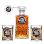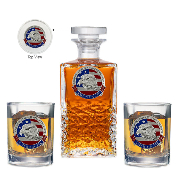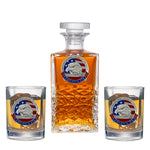 This 25-ounce glass decanter is embellished with a fine pewter casting matched with two Double Old Fashioned Glasses. A great addition to any home bar! Made in USA.