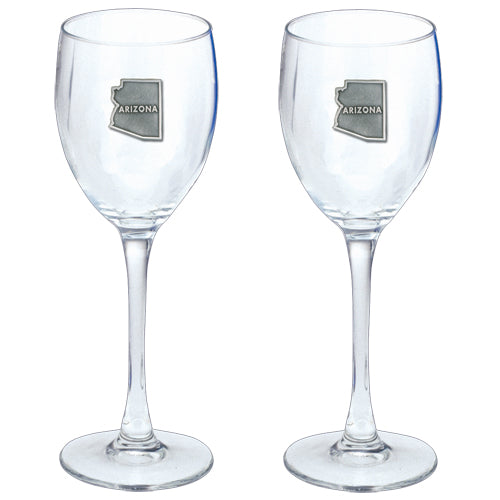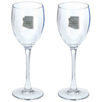 This is a set of two 12 ounce glass goblets with a fine pewter logo medallion bonded to the side. It could be used to serve water, wine or other beverages. Made in USA.