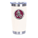 This 20 oz double wall stainless steel (no handle) thermal drink mug is insulated and it is stainless inside and out. It is embellished with a fine pewter decorative casting. The lid has a non-spill feature. The absence of a handle makes it perfect for you car's drink holder.