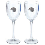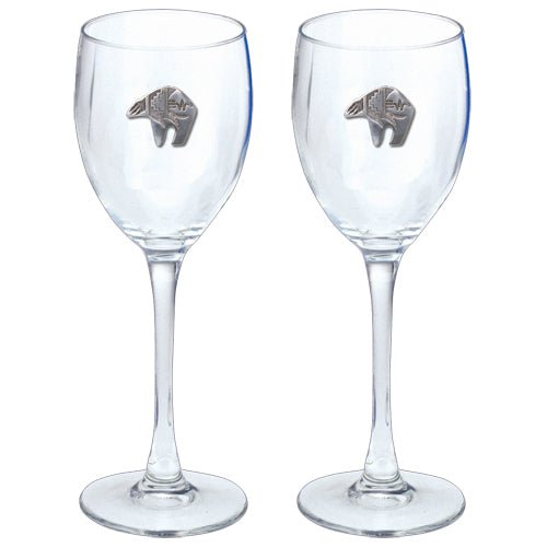 This is a set of two 12 ounce glass goblets with a fine pewter logo medallion bonded to the side. It could be used to serve water, wine or other beverages. Made in USA.