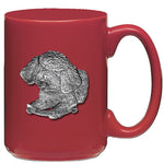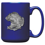 This coffee mug is decorated with a fine pewter casting. It is microwaveable and dishwasher safe with no heat cycle.. The glass coffee mug is 16 ounces, and the ceramic coffee mug is 15 ounces.