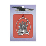 This fine pewter ornament is detailed on both sides. It comes with satin ribbon and in a window package. Use it on your tree, car mirror, or other applications! Made in USA.