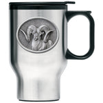 This double wall stainless steel travel mug is insulated and it is stainless inside and out. It is embellished with a fine pewter decorative casting. The lid has a non-spill...