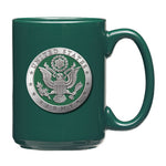 This coffee mug is decorated with a fine pewter casting. It is microwaveable and dishwasher safe with no heat cycle.. The glass coffee mug is 16 ounces, and the ceramic coffee mug is 15 ounces.