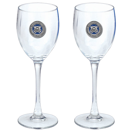 This is a set of two 12 ounce glass goblets with a fine pewter logo medallion bonded to the side. It could be used to serve water, wine or other beverages. Made in USA.