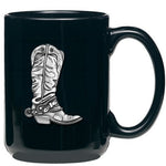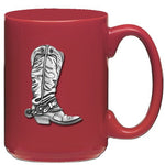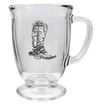 This coffee mug is decorated with a fine pewter casting. It is microwaveable and dishwasher safe with no heat cycle.. The glass coffee mug is 16 ounces, and the ceramic coffee mug is 15 ounces.