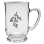 This coffee mug is decorated with a fine pewter casting. It is microwaveable and dishwasher safe with no heat cycle.. The glass coffee mug is 16 ounces, and the ceramic coffee mug is 15 ounces.