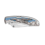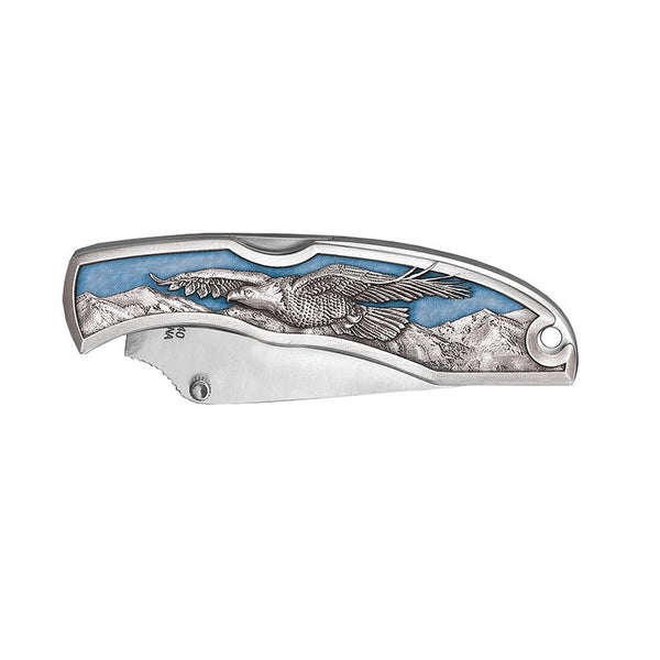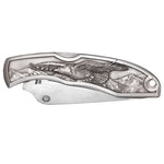 This knife is constructed of stainless steel with fine pewter accent details. It is equipped with a belt clip on the back side and also included is a nylon pouch. This is all contained in the clear-top gift box. Assembled in USA.