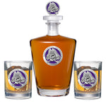 This is a set of a 25-ounce glass decanter with a fine pewter casting, 3D Topper, and two Double Old Fashioned Glasses. A great addition to any home bar! Made in USA.