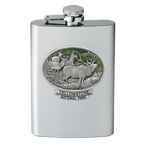 This 8 ounce stainless steel flask is embellished with a fine pewter casting. Assembled in USA. Yellowstone National Park banner prominently displayed.