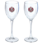 This is a set of two 12 ounce glass goblets with a fine pewter logo medallion bonded to the side. It could be used to serve water, wine or other beverages. Made in USA.