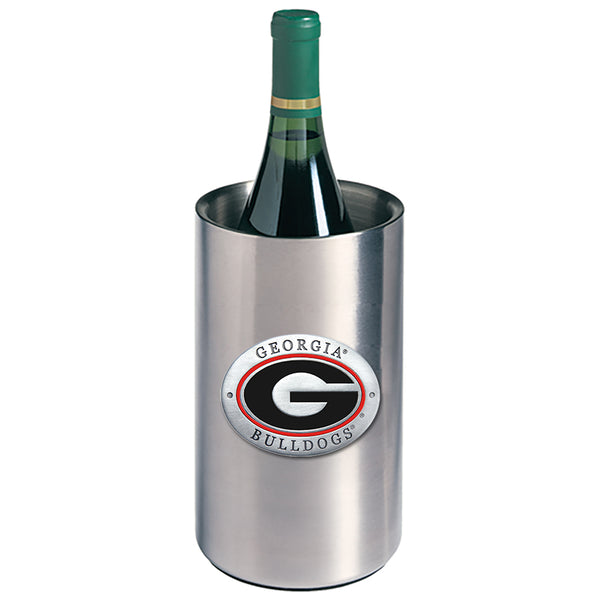 This is a wine chiller made of double-wall insulated stainless steel with a fine pewter logo medallion bonded to the front.