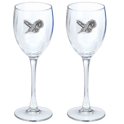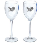 This is a set of two 12 ounce glass goblets with a fine pewter logo medallion bonded to the side. It could be used to serve water, wine or other beverages. Made in USA.