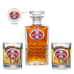 This 25-ounce glass decanter is embellished with a fine pewter casting matched with two Double Old Fashioned Glasses. A great addition to any home bar! Made in USA.