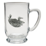 This coffee mug is decorated with a fine pewter casting. It is microwaveable and dishwasher safe with no heat cycle.. The glass coffee mug is 16 ounces, and the ceramic coffee mug is 15 ounces.
