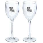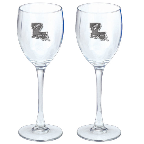 This is a set of two 12 ounce glass goblets with a fine pewter logo medallion bonded to the side. It could be used to serve water, wine or other beverages. Made in USA.