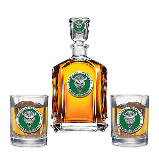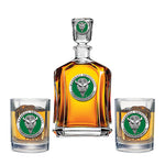 This 24-ounce glass decanter is embellished with a fine pewter casting. It comes with two Double Old Fashioned glasses. A great addition to any home bar! Made in USA.