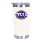 This 20 oz double wall stainless steel (no handle) thermal drink mug is insulated and it is stainless inside and out. It is embellished with a fine pewter decorative casting. The lid has a non-spill feature. The absence of a handle makes it perfect for you car's drink holder.