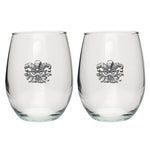 This is a set of two 12 ounce glass goblets with a fine pewter logo medallion bonded to the side. It could be used to serve water, wine or other beverages. Made in USA.