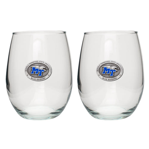 This is a set of two 12 ounce glass goblets with a fine pewter logo medallion bonded to the side. It could be used to serve water, wine or other beverages. Made in USA.
