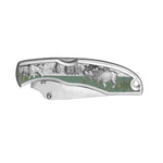 This knife is constructed of stainless steel with fine pewter accent details. It is equipped with a belt clip on the back side and also included is a nylon pouch. This is all contained in the clear-top gift box. Assembled in USA.