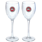 This is a set of two 12 ounce glass goblets with a fine pewter logo medallion bonded to the side. It could be used to serve water, wine or other beverages. Made in USA.