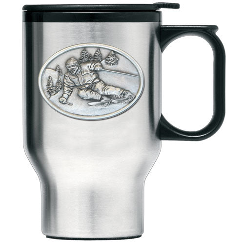 This double wall stainless steel travel mug is insulated and it is stainless inside and out. It is embellished with a fine pewter decorative casting. The lid has a non-spill feature.