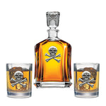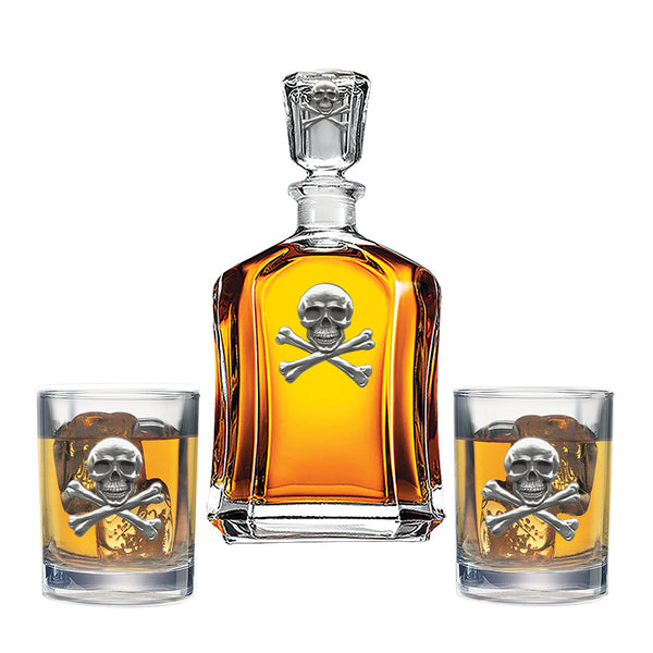 This 24-ounce glass decanter is embellished with a fine pewter casting. It comes with two Double Old Fashioned glasses. A great addition to any home bar! Made in USA.