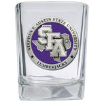 This 1.5 ounce square shot glass is highlighted with a fine pewter casting. Made in USA.
