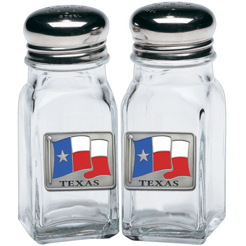 This is a set of salt & pepper shakers with a fine pewter logo medallion bonded to the side. Made in USA.