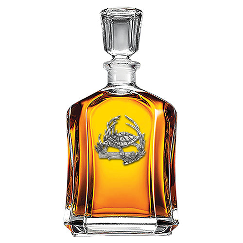 This 24 ounce glass decanter is embellished with a fine pewter casting. It is a great match with two Double Old Fashioned glasses. A great addition to any home bar! Made in USA.