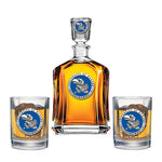 This 24-ounce glass decanter is embellished with a fine pewter casting. It comes with two Double Old Fashioned glasses. A great addition to any home bar! Made in USA.
