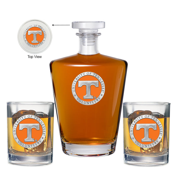 This 25 ounce glass decanter is embellished with a fine pewter casting. Added 14 ounce two double old fashioned glass is the ultimate vessel for your favorite beverage. It is exquisitely detailed with a fine pewter casting. Made in USA.