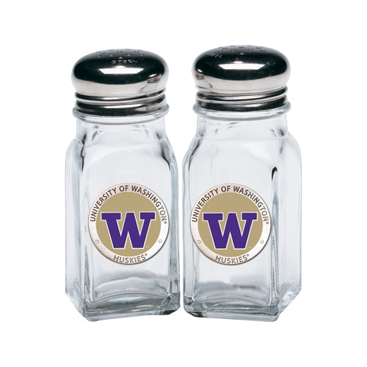 This is a set of salt & pepper shakers with a fine pewter logo medallion bonded to the side. Made in USA.