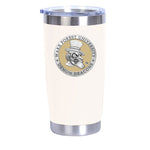 This 20 oz double wall stainless steel (no handle) thermal drink mug is insulated and it is stainless inside and out. It is embellished with a fine pewter decorative casting. The lid has a non-spill feature. The absence of a handle makes it perfect for you car's drink holder.