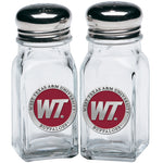 This is a set of salt & pepper shakers with a fine pewter logo medallion bonded to the side. Made in USA.